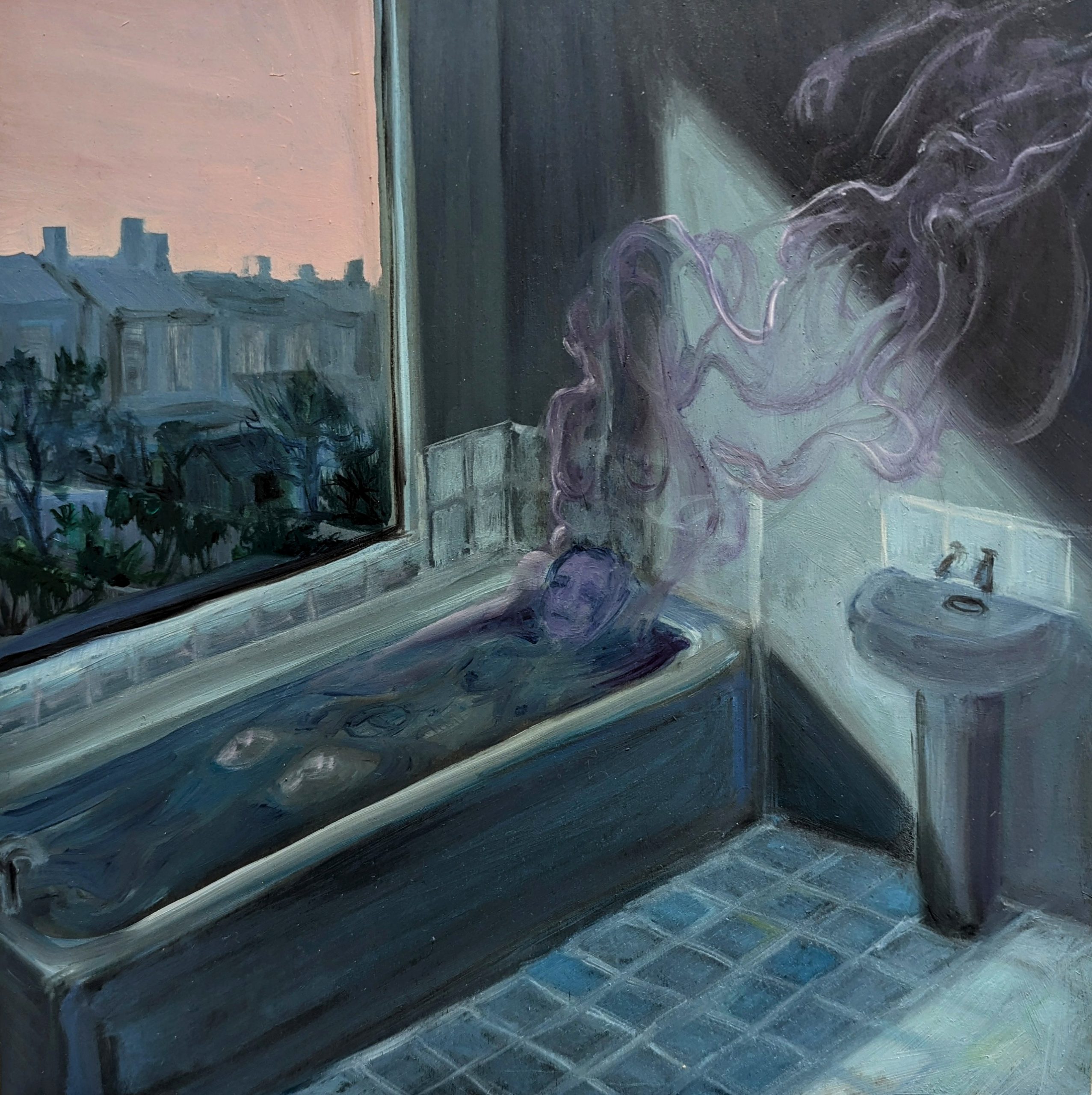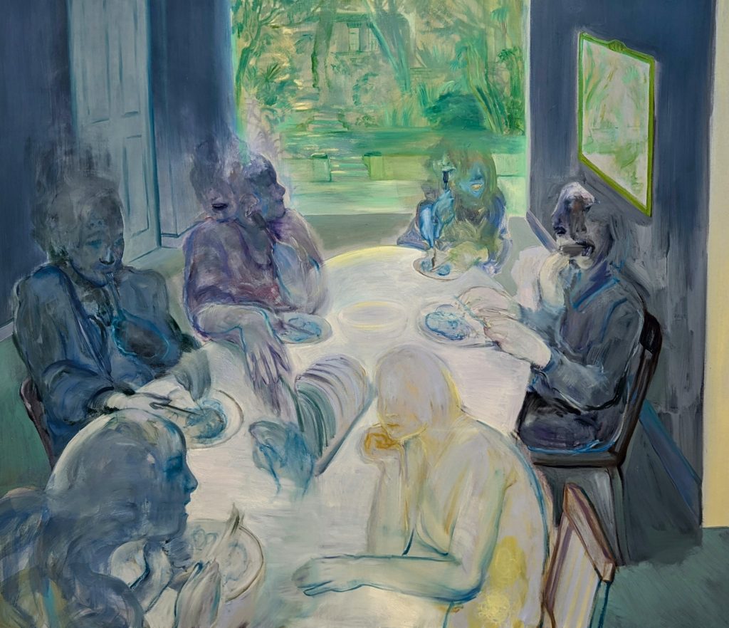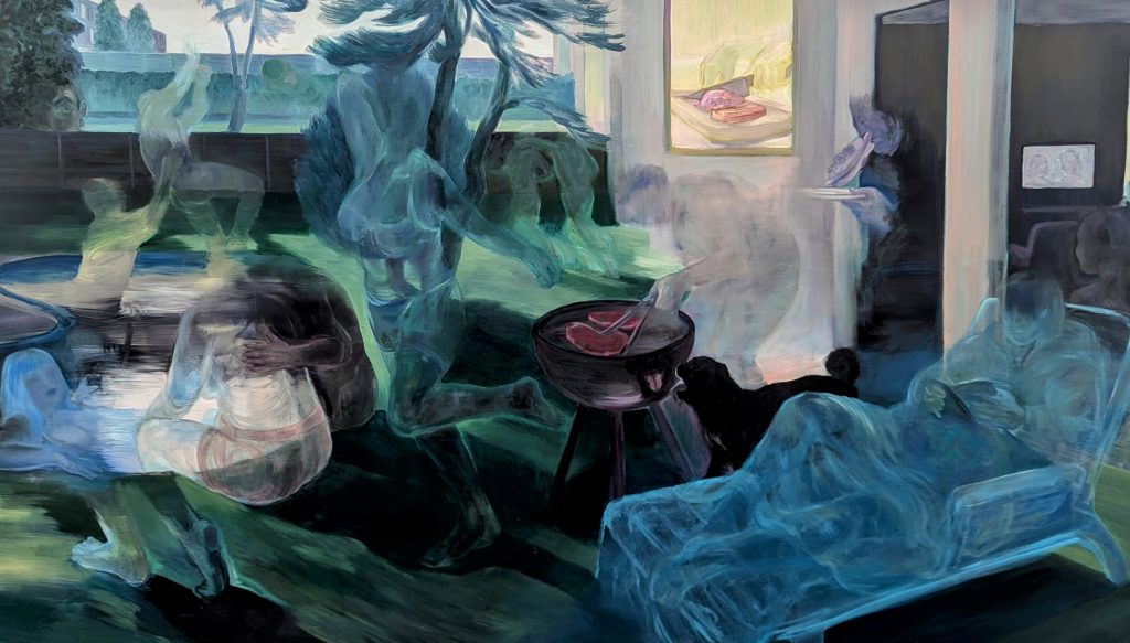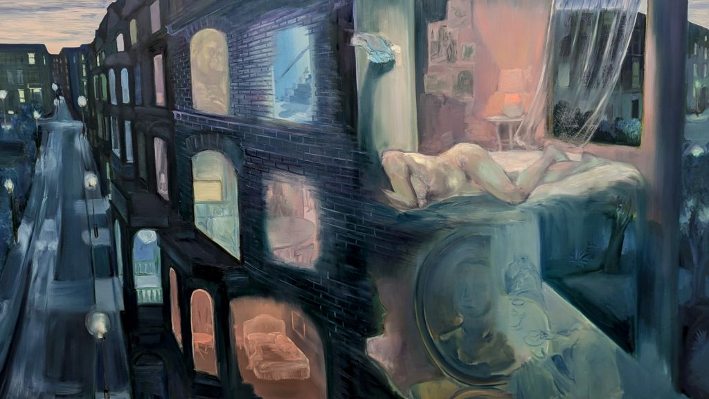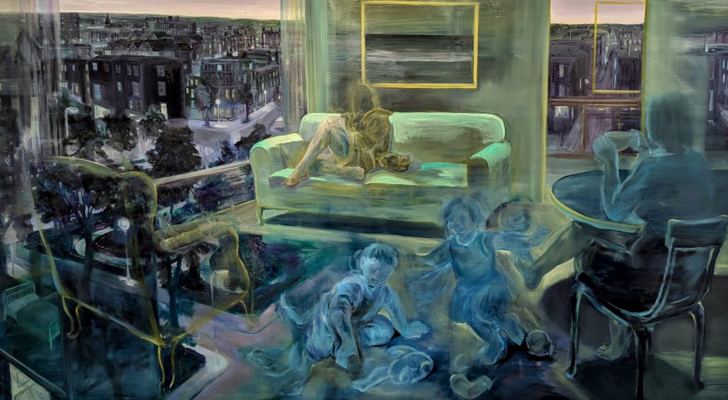 The figures on the walls seem sad at first viewing, yet after a while of walking amongst them, it is not sadness that is the overwhelming emotion. It feels as if they are waiting, that they have suspended their beings in anticipation of a future that will not be where they are right now. They are held in this transitory stasis, sat on sofas, sprawled across beds. They are both residents of the mundane and beautiful shining beacons of another world.